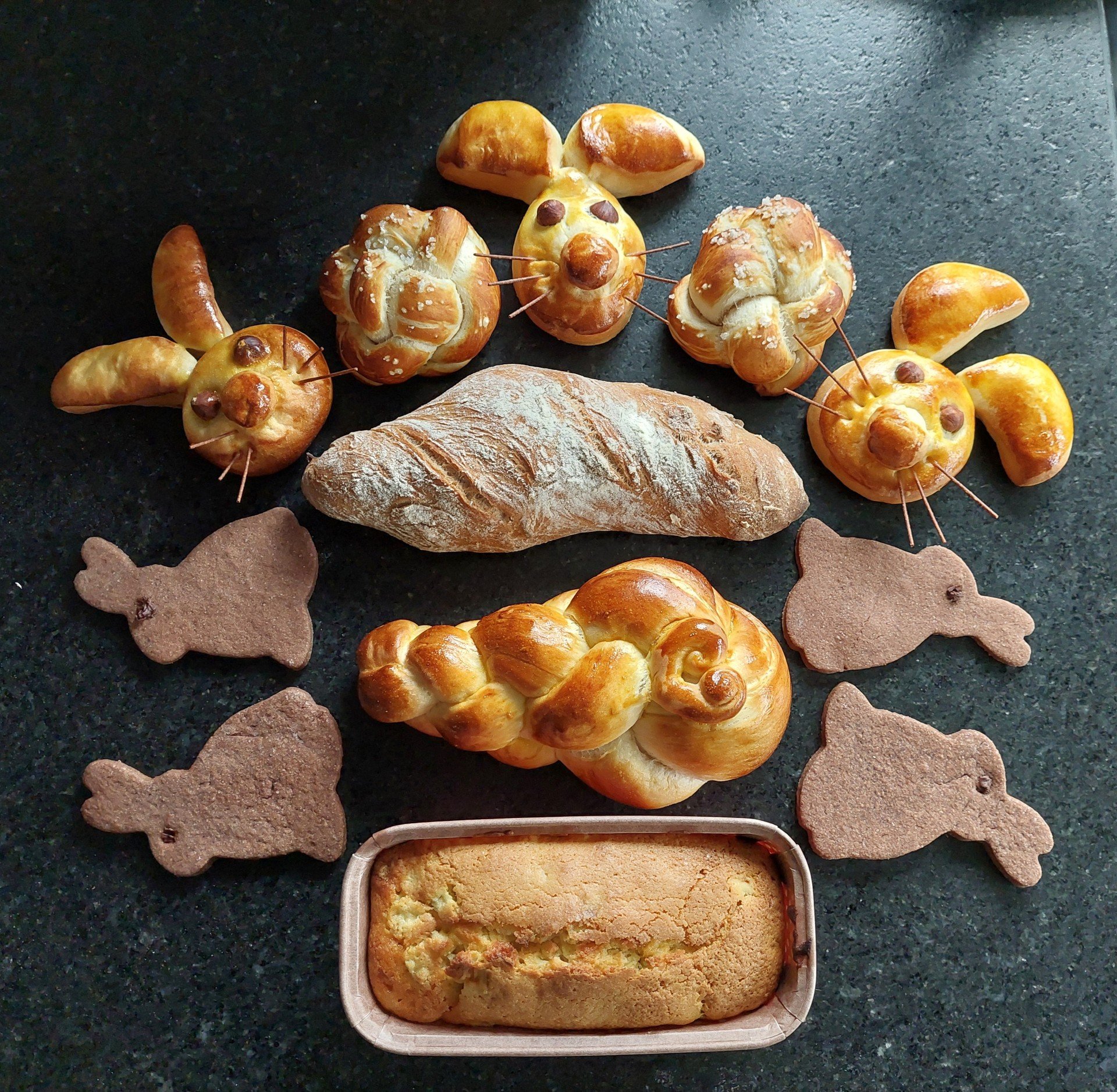 frischgebackene Zöpfe, verschiedene Brote und Brötli und Kuchen oder Kleingebäck.